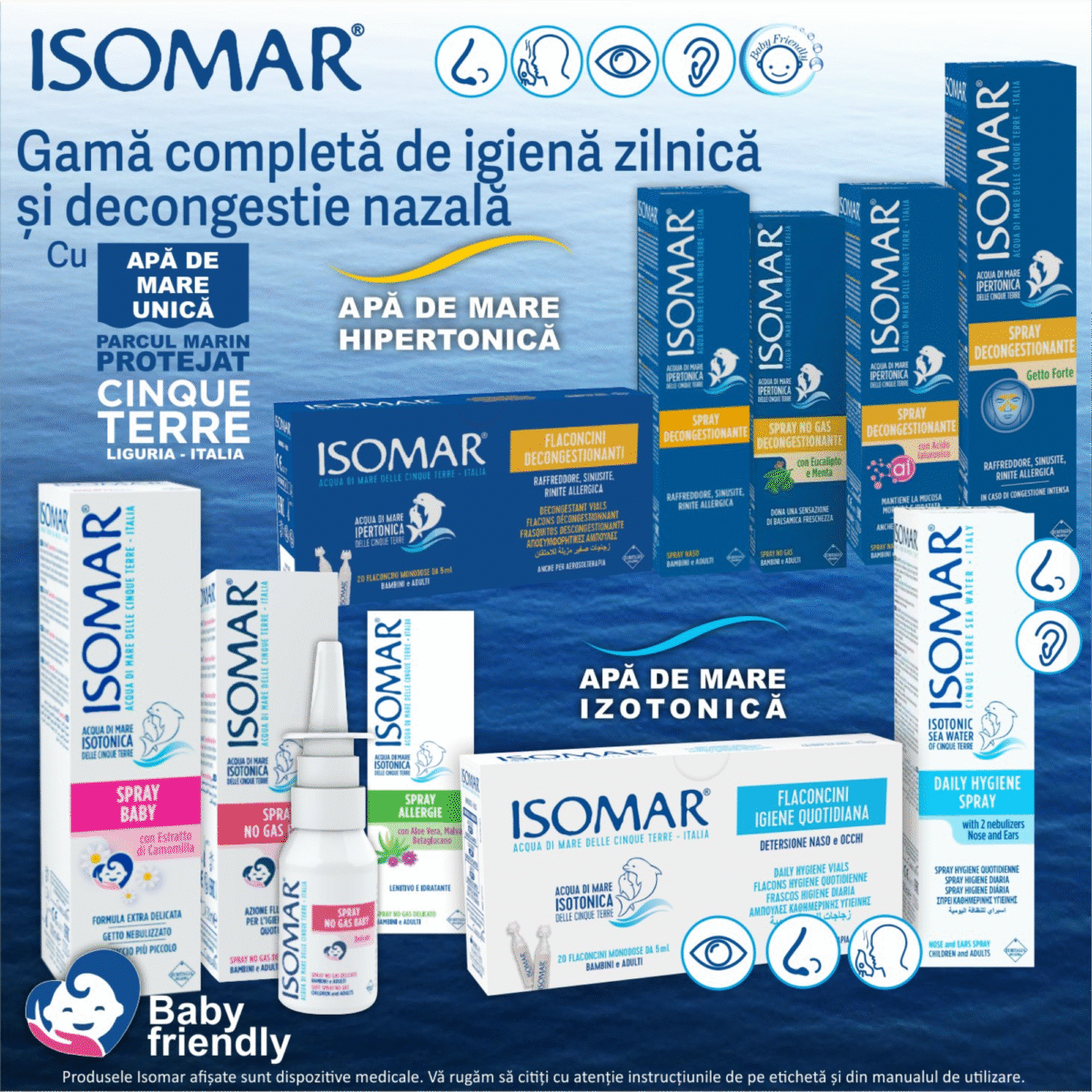Iar pentru că pentru unii dintre noi această perioadă nu înseamnă doar iz de vacanță, ci și ochi roșii, nas care curge, strănut sau senzație de mâncărime a ochilor sau a nasului, vreau să vin cu o sugestie ce poate ajuta la prevenirea simptomelor alergiilor respiratorii și de la polen, ce poate fi folosit în fiecare zi, chiar și pentru perioade lungi de timp, fără contraindicații și fără să provoace dependență. Este vorba de produsele ISOMAR.