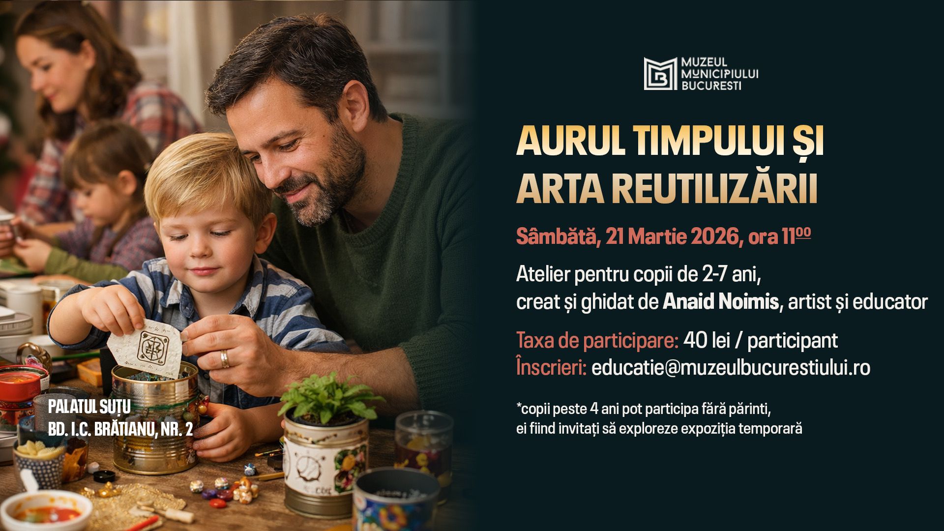 Acest atelier susține relația părinte–copil, creativitatea, autonomia și educația ecologică prin upcycling, oferind o conexiune emoțională cu patrimoniul cultural.
