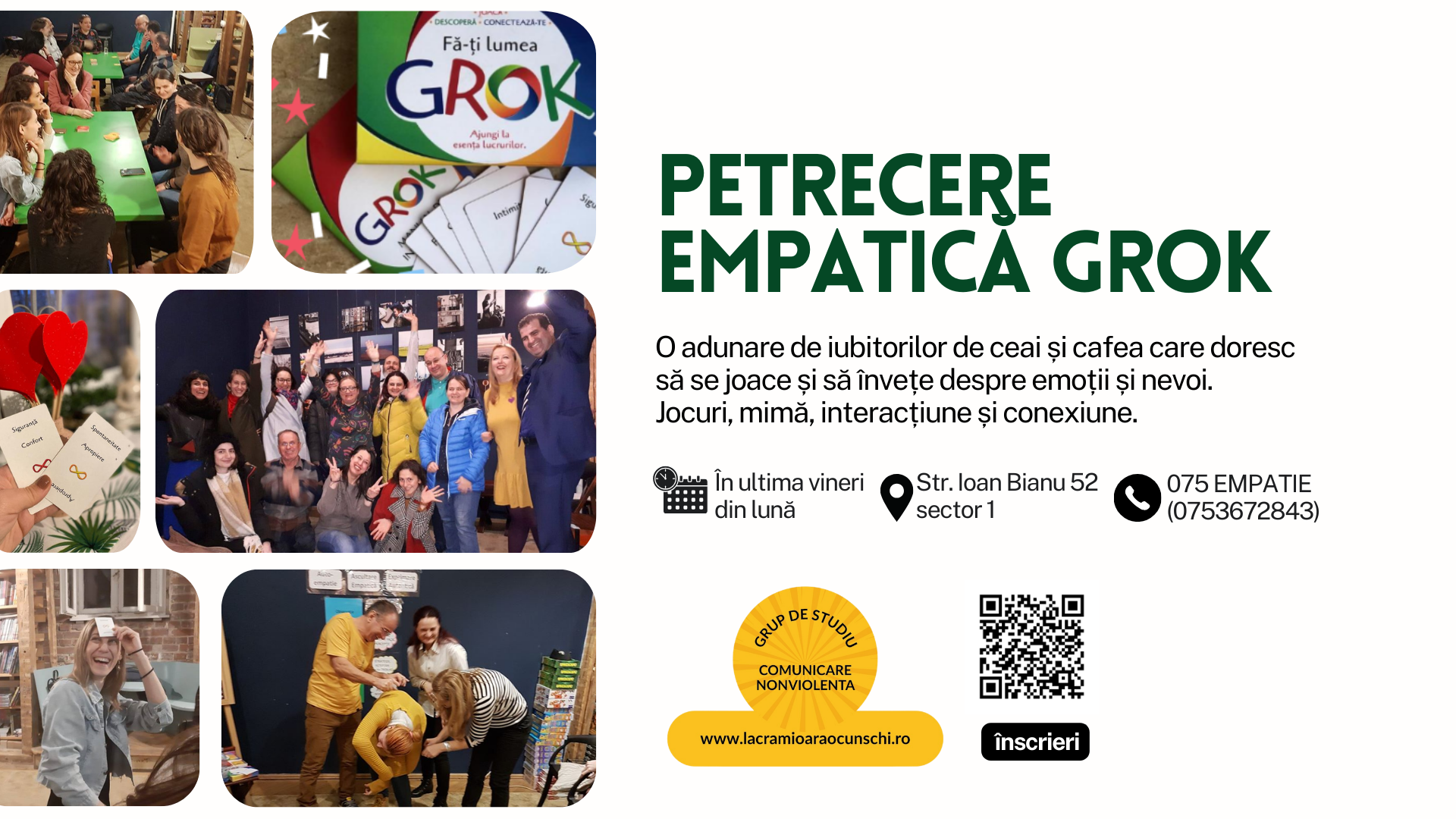„Seara Grok party” este o petrecere empatică interactivă în care participanții se joacă și se conectează prin activități de comunicare empatică, explorând emoții, nevoi și ascultarea profundă într-un mod jucăuș și participativ.