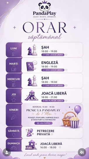 Programul săptămânal PandaPlay combină perfect joaca liberă cu activități educative precum șah și engleză, oferind copiilor un mediu sigur, modern și distractiv.