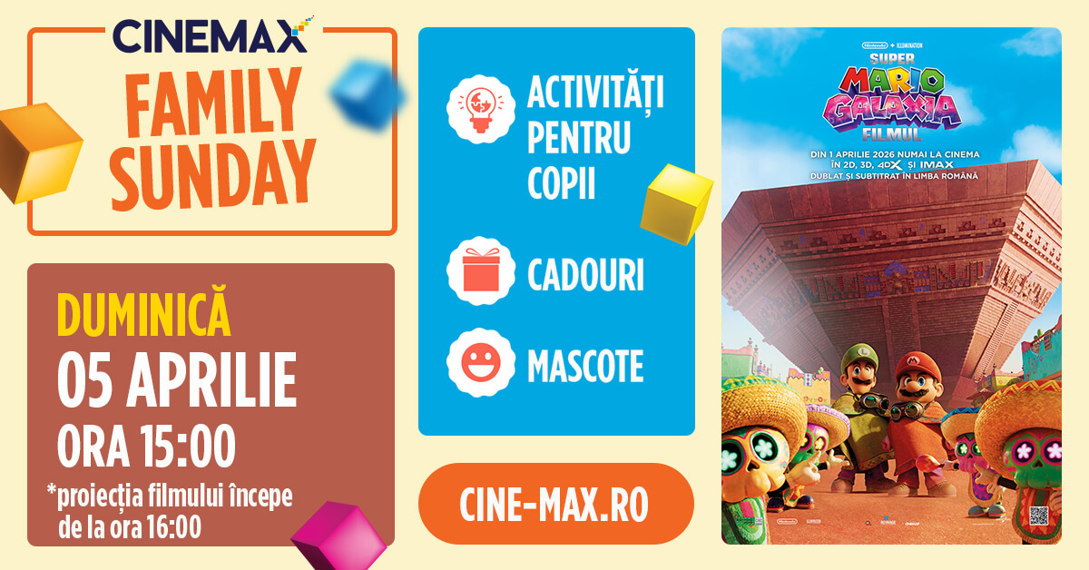 Pe 5 aprilie, CINEMAX Veranda invită familiile la o nouă ediție a evenimentului Family Sunday, dedicat copiilor și timpului petrecut împreună la cinema. De această dată, cei mici sunt așteptați la Super Mario Galaxia: Filmul, într-o după-amiază plină de jocuri, activități și cadouri.