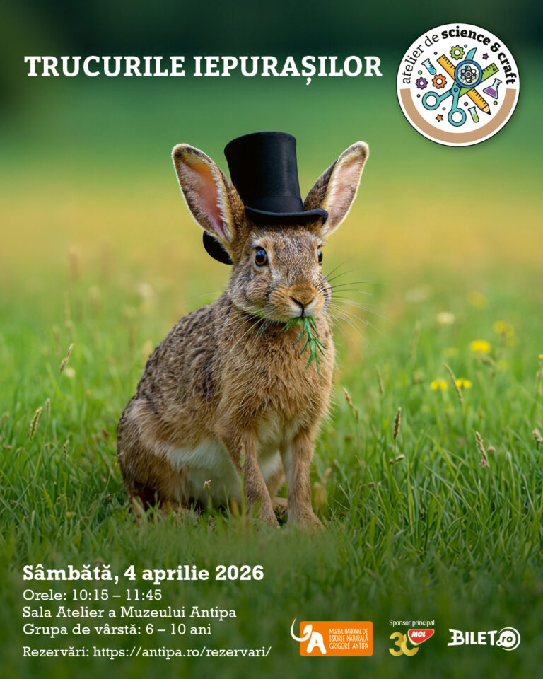 Atelierele se desfășoară sâmbătă, 4 aprilie 2026, în Sala Atelier a Muzeului Antipa, între orele 10:15 – 11:45.