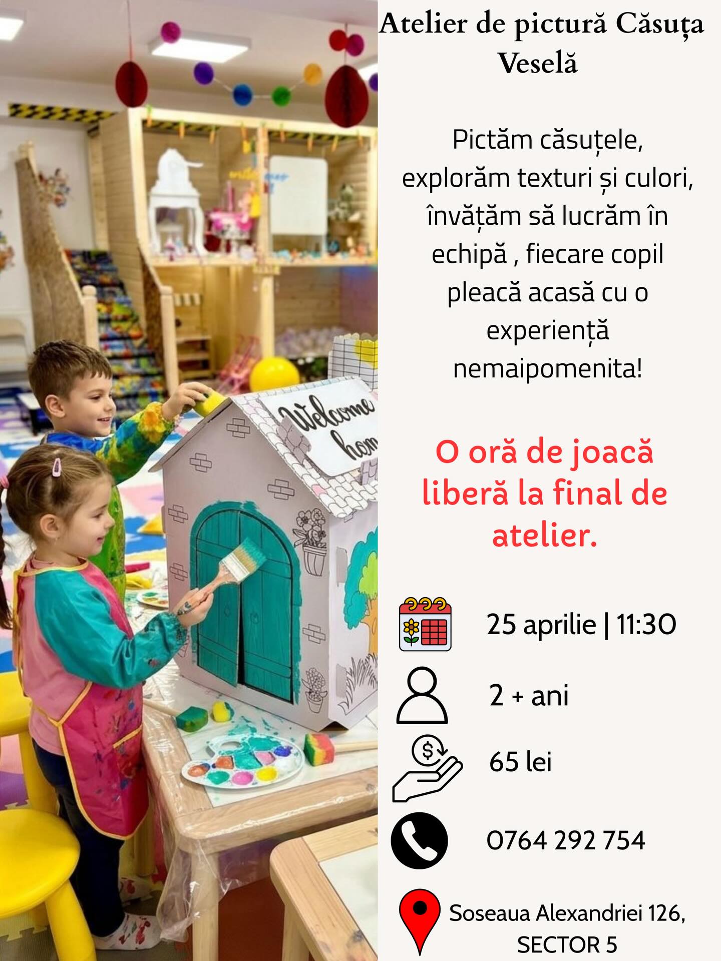 apr. 25 11:30 am - 12:30 pm Atelier de pictură “Căsuța Veselă” Minitopia Șoseaua Alexandriei 126, 051543 București, București Eveniment Details Get Directions