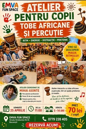 Emva Fun Space Strada Străduinței, 041776 București, București, Sector 4, RomaniaAtelier pentru copii – Tobe Africane & Percuție la EMVA Fun Space! Pregătiți-vă pentru o experiență plină de ritm, energie și distracție! Cei mici vor descoperi […]